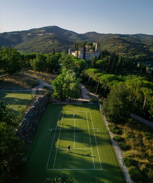 Nestled amid Umbria’s rolling hills, Reschio is an Italian estate where sport, family life, and old-world charm coexist. Its grass tennis courts catch the early-morning sun, providing an idyllic stage for family tournaments or casual doubles. Villas across the estate are expansive, with private pools and terraces that allow multi-gen groups to enjoy the estate together. Beyond the court, days can unfold wandering olive groves, tasting local wines, or exploring nearby medieval towns. Light shifts across the landscape as rallies unfold, making each match cinematic without ever feeling contrived.