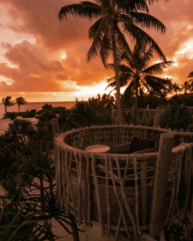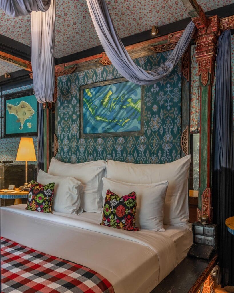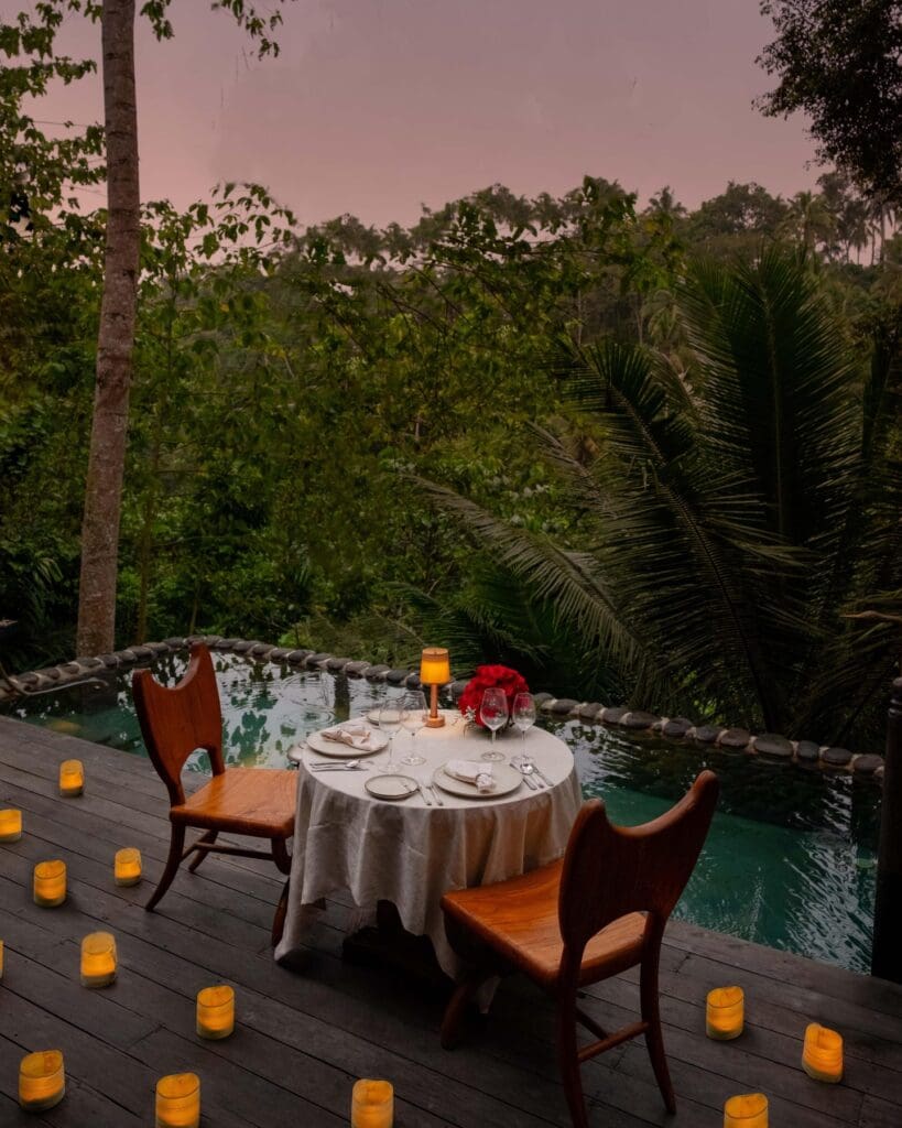 Tucked into the Keliki Valley, Capella Ubud feels like a secret the jungle has been keeping. Bensley’s tented villas nod to spice-trade explorers, with four-poster beds draped in ikat textiles, telescopes at the ready, and artisan touches everywhere you look. Days drift to the rhythm of the river: a swim, a paddle, a walk through emerald terraces. Meals are epic (and the hotel comes with a MICHELIN Key) – from Japanese robatayaki tasting menus at Api Jiwa to local seafood and Wagyu at Mads Lange, every dish feels instinctively personal. Cocktails are house-aged, barrel-finished, and often infused with local flavours, giving you a reason to linger. By night, lantern-lit paths and the jungle’s hush create a rare kind of intimacy, where romance grows naturally in the rhythm of the valley, not in a staged moment.